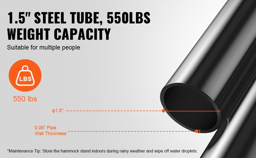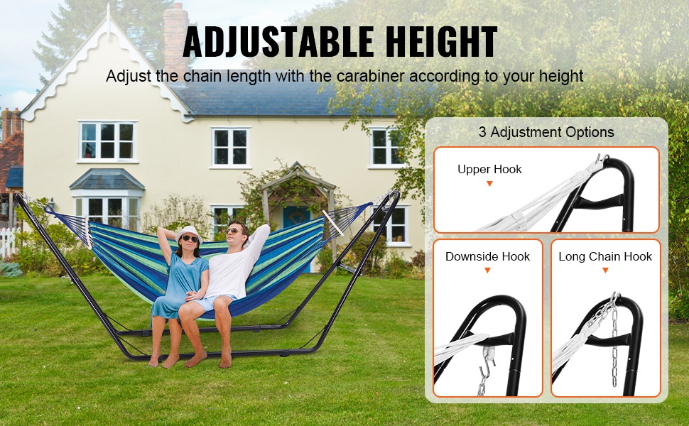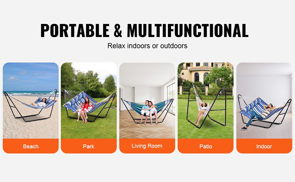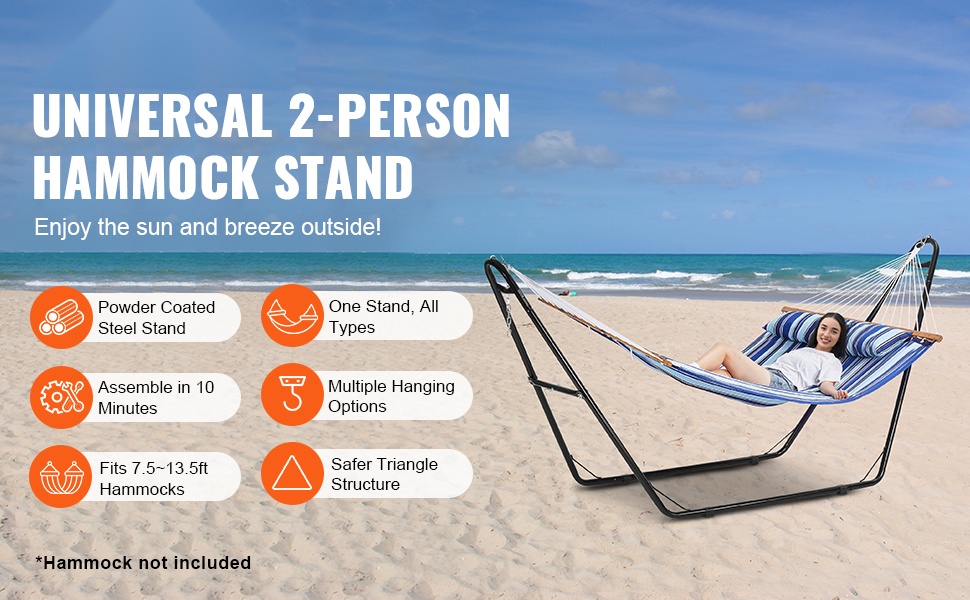 Riippumattoteline sopii sekä yhden että kahden hengen riippumatoille, joiden pituus on 9.5–12.6 ft (2.9–3.85 m). Se tukee useita riippumattotyyppejä, kuten brasilialaiset riippumatot, kaarevat mallit ja poikkipuuriippumatot, joten voit käyttää nykyistä riippumattoasi ilman lisävarusteita.