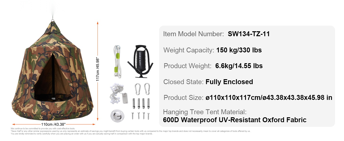 Riippuva telttakeinu kestää jopa 330 paunaa, joten se sopii sekä lapsille että aikuisille. Yläosan moninkertaisesti tikatut saumat ja tukevat ripustusrenkaat parantavat vakautta ja turvallisuutta niin sisä- kuin ulkokäytössä.