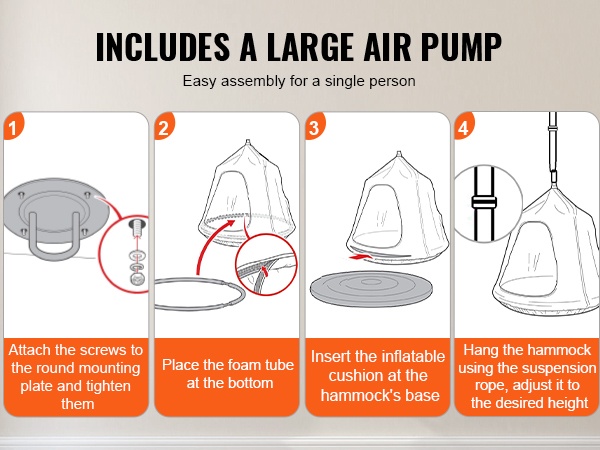 Mukana tuleva suuri ilmapumppu helpottaa ilmatyynyn täyttämistä ja kokoamisen voi tehdä tarvittaessa yksin. Asennus käy vaiheittain: kiinnitä pyöreä kattorengas ruuveilla, aseta muotoa tukevat vaahtoputket ja ilmatyyny, ripusta teltta ja säädä korkeus – et tarvitse lisätyökaluja.