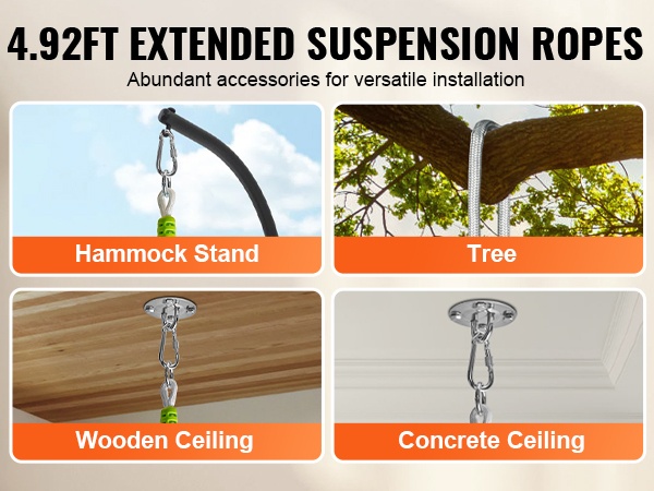 4.92 jalkaa / 1.5 m pitkä jatkoköysi mahdollistaa joustavan sijoittelun. Teltta voidaan ripustaa esimerkiksi keinutelineeseen, puunoksaan tai puu- ja betonikattoon. Mukana tulevat laajennusankkurit ja puuruuvit tekevät kiinnityksestä tukevan ja selkeän.
