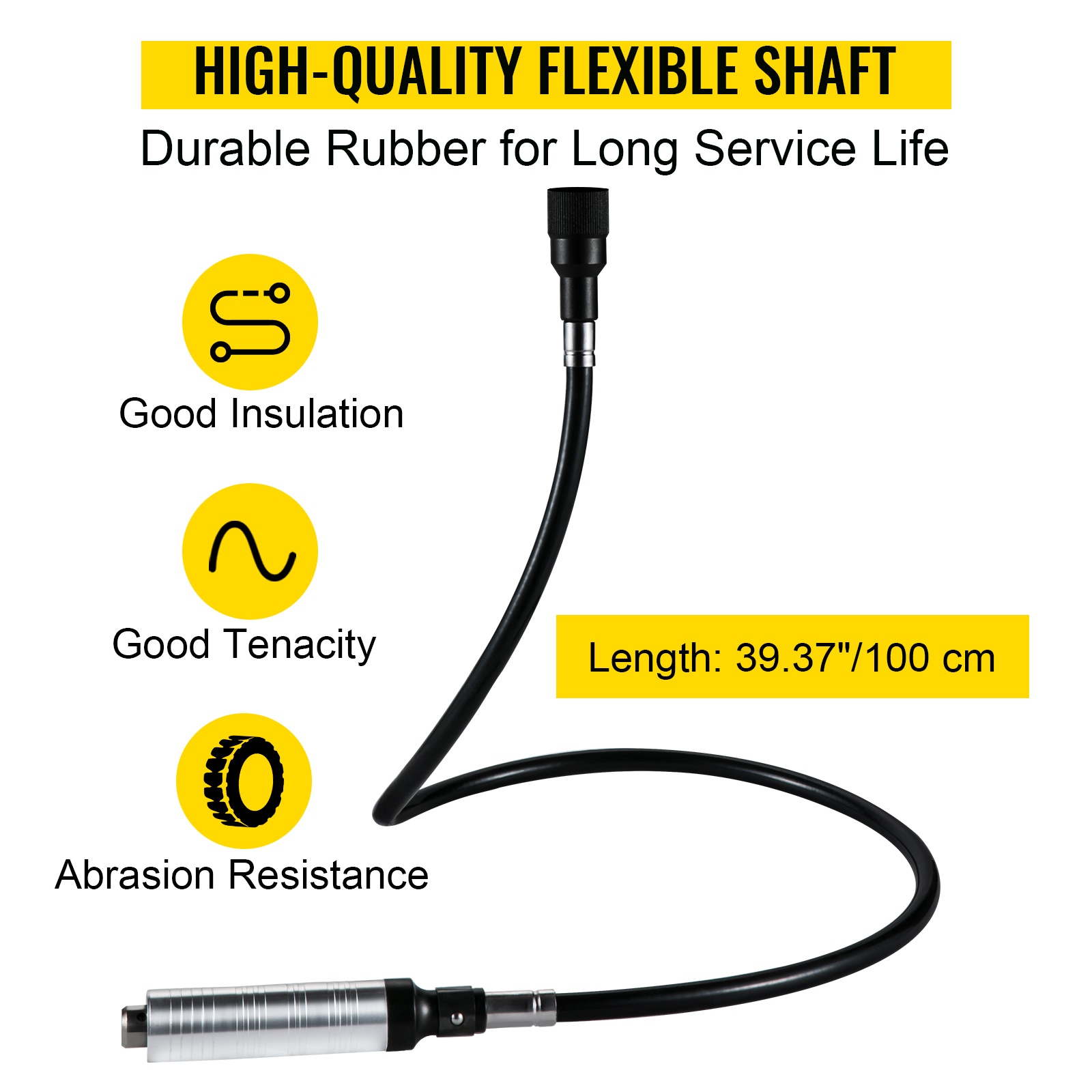 Joustava akseli on valmistettu vahvistetusta kumista ja sisäisestä teräsrakenteesta, mikä antaa sille hyvän lujuuden, lämmönkeston ja taipuisuuden. Ripustettava rakenne tekee työkalun käsittelystä kevyttä esimerkiksi korupajassa, autotallissa tai verstaassa.