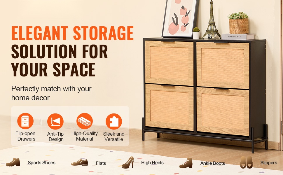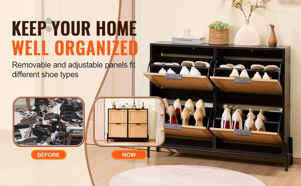 Muuta eteinen siistiksi ja yhtenäiseksi kokonaisuudeksi tämän monikäyttöisen rottinkisen kenkäkaapin avulla. Viisi tasoa ja säädettävät hyllyt tarjoavat runsaasti tilaa erikokoisille kengille ja auttavat pitämään arjen tavarat hyvässä järjestyksessä.