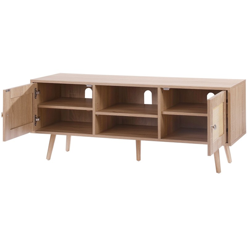 Rottinkikaapit molemmilla sivuilla tarjoavat runsaasti tilaa tavaroille, jotka haluat pitää poissa näkyvistä. Keskimmäinen avohylly sopii hyvin viihdelaitteille ja muille esineille, ja säädettävä korkeus auttaa hyödyntämään tilan tehokkaasti.