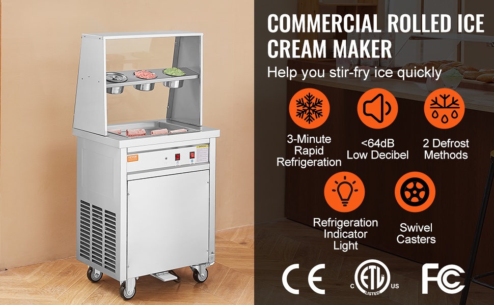 Tällä paistetun jäätelön rullakoneella valmistat helposti jäätelöä, jäätelörullia ja frozen yogurt -herkkuja kotona tai ammattikeittiössä. Integroitu kompressori jäähdyttää nopeasti ja mahdollistaa ainesosien pakastamisen noin 3 minuutissa. Käyntiääni pysyy alle 60 dB, joten laite sopii hyvin myös kotikeittiöön.