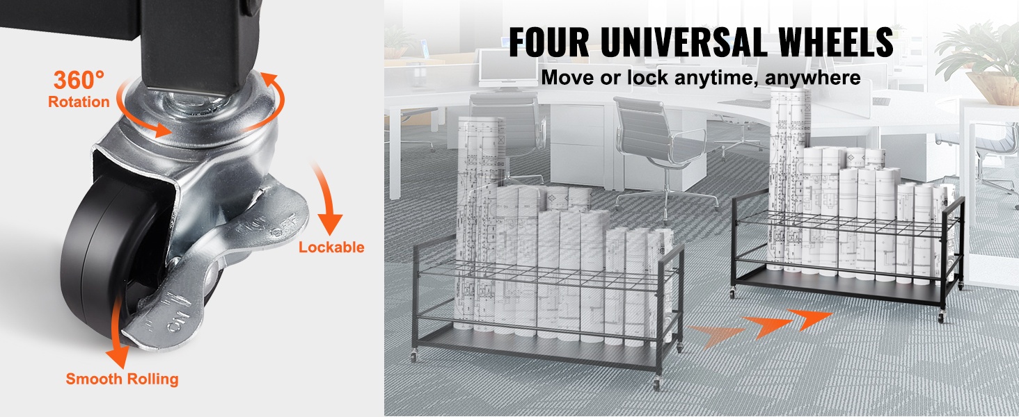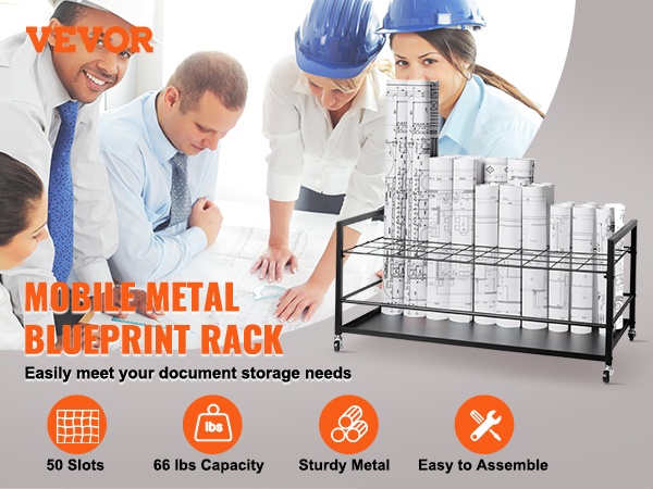 Tämä rullapiirustusteline tarjoaa käytännöllisen ratkaisun piirustusten, karttojen, julisteiden ja muiden suurikokoisten asiakirjojen säilytykseen toimistossa, kotona tai oppilaitoksissa. Metallirakenne, 50 lokeroa ja siirtopyörät tekevät säilytyksestä selkeää ja telineen siirtämisestä helppoa.