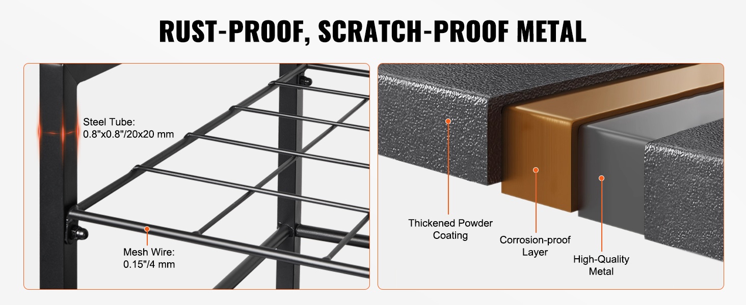 Teline on valmistettu paksunnuksesta metallista, jossa on ruostumista ehkäisevä jauhemaalaus. 5 mm lankapaksuus parantaa kantavuutta ja varmistaa rakenteen tukevuuden pitkäaikaisessa käytössä.
