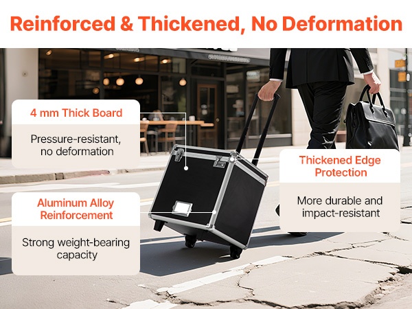 Kannettava asiakirjalaatikko sisältää 4-osaisen teleskooppikahvan, tukevat pyörät ja miellyttävän kädensijan. Laatikkoa voi työntää tai vetää sulavasti, mikä helpottaa ja vakauttaa kuljettamista.