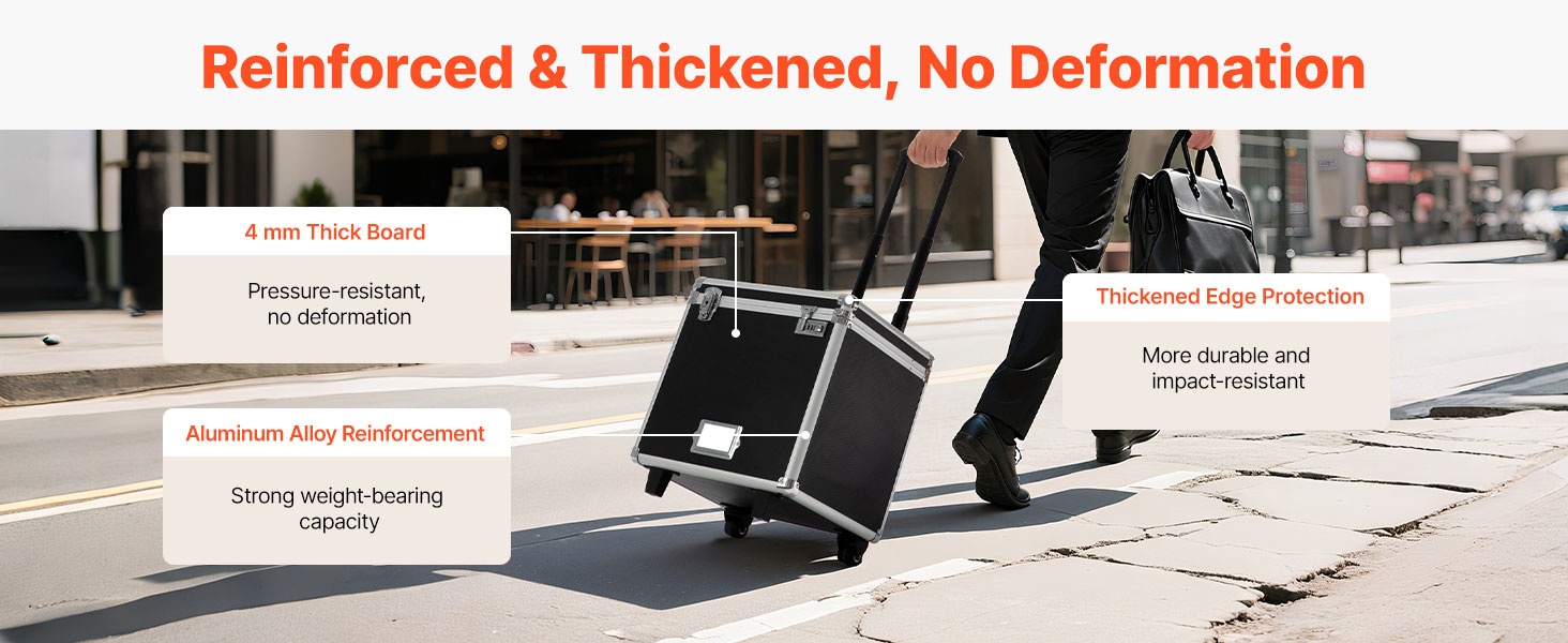 Käsin vedettävä asiakirjakotelo on valmistettu 4 mm paksuista paneeleista ja alumiiniseosrungosta. Vahvistetut kulmat parantavat iskunkestävyyttä ja tarjoavat asiakirjoille pitkäaikaisen ja luotettavan suojan.