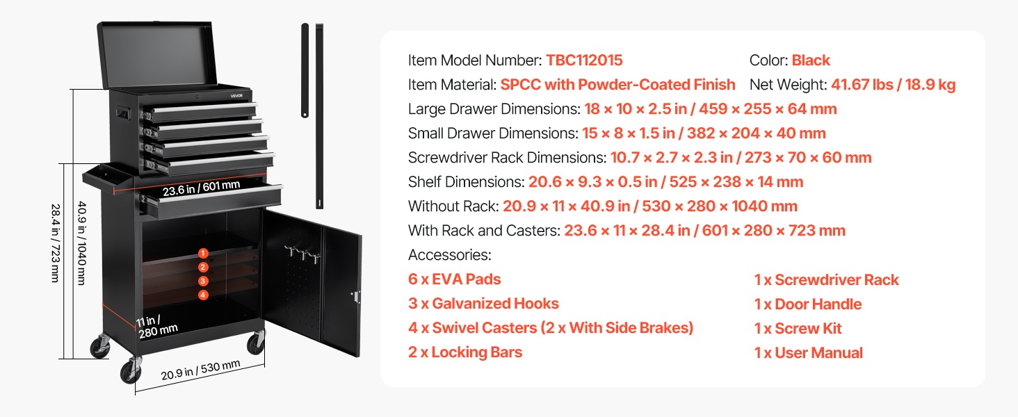Tämä rullattava työkalukaappi voidaan jakaa nelilaatikkoiseen työkalupakkiin ja liikuteltavaan alaosaan. Yläallas, laatikosto, pyörillä varustettu alakaappi ja sivun työkaluteline tarjoavat runsaasti tilaa erikokoisille työkaluille sekä helpottavat niiden pitämistä järjestyksessä.