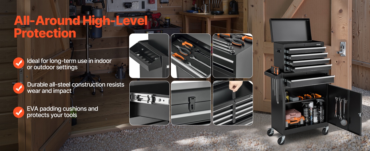 - EVA-pehmusteet työtasoissa ja laatikoissa suojaavat työkaluja