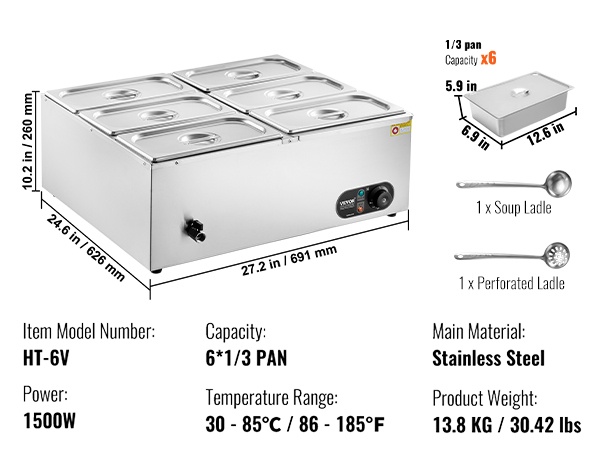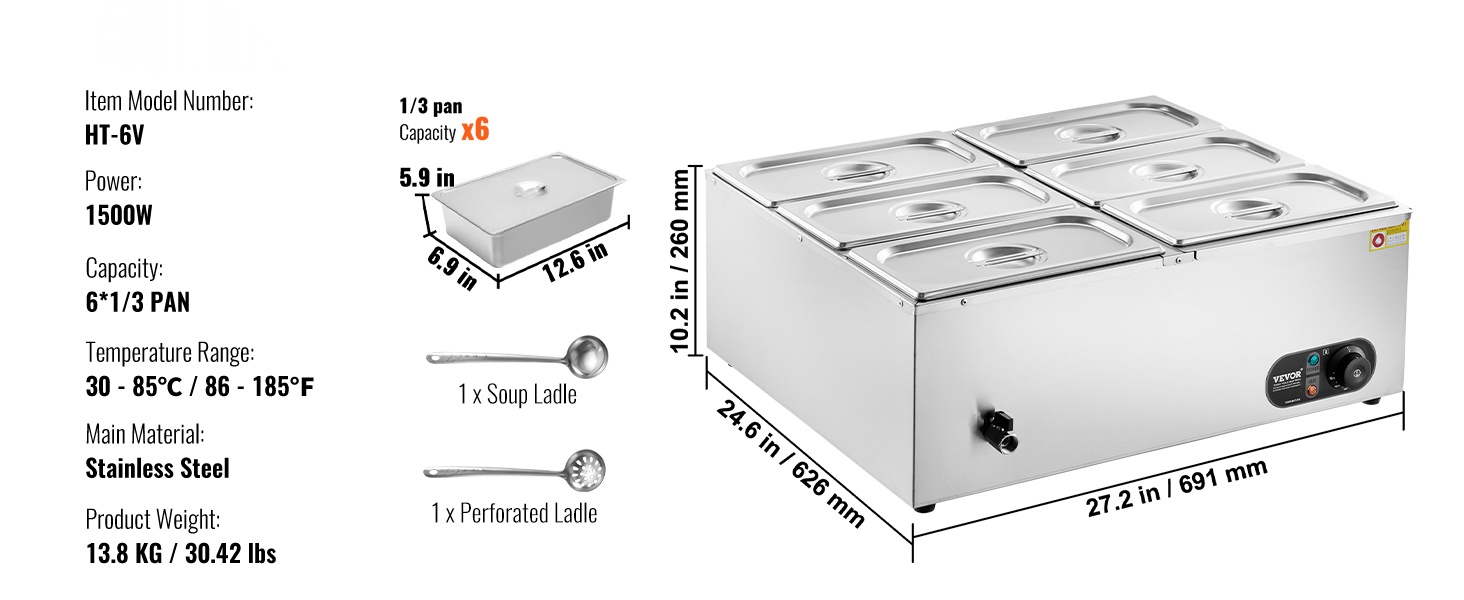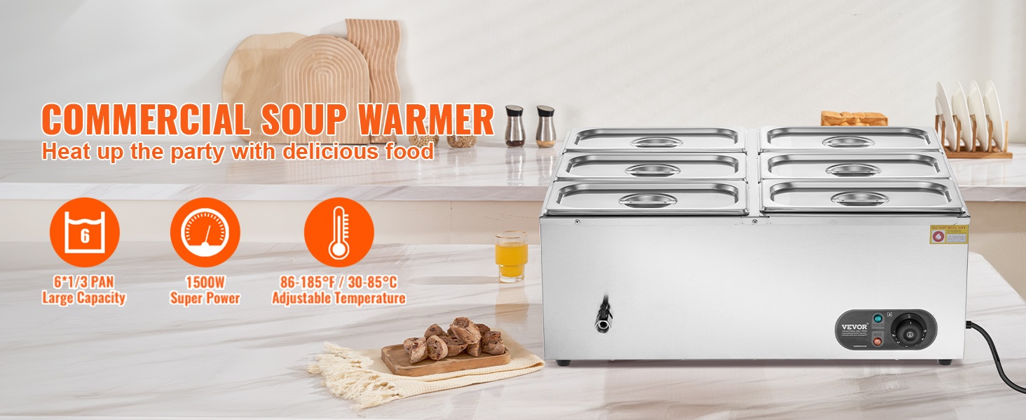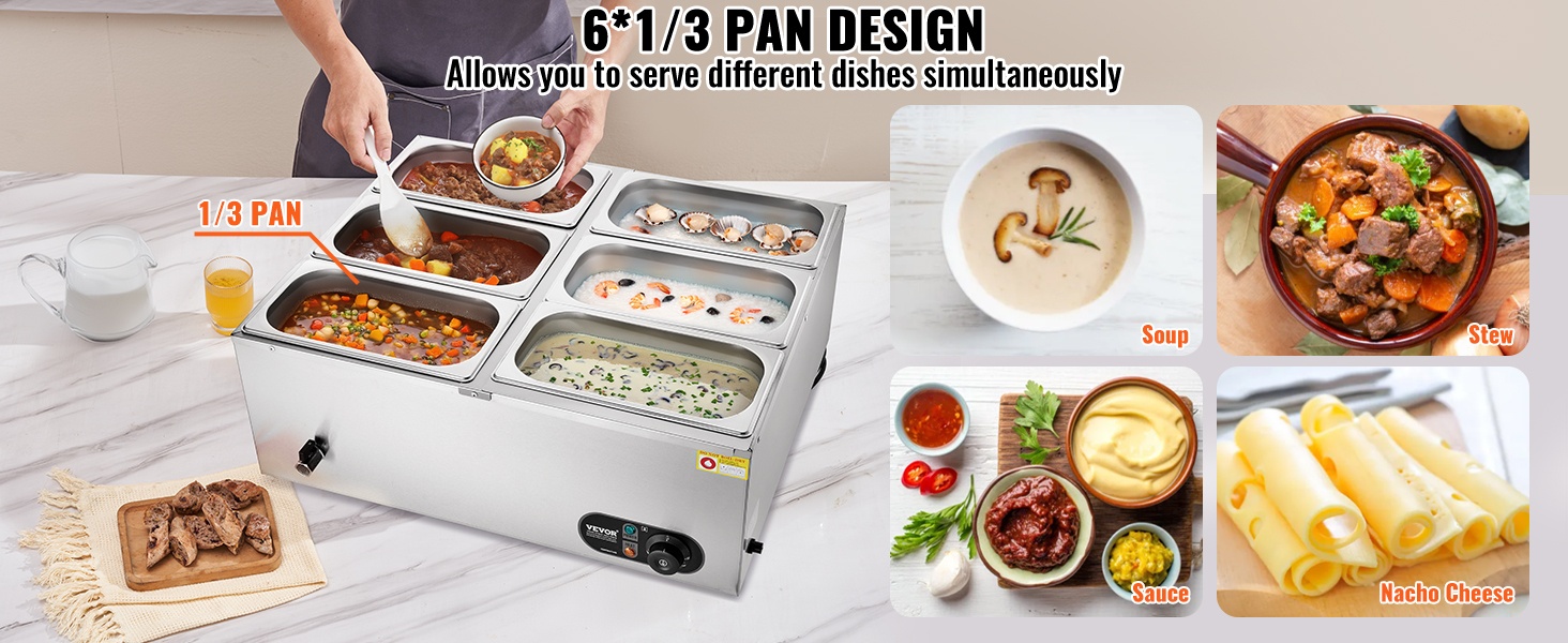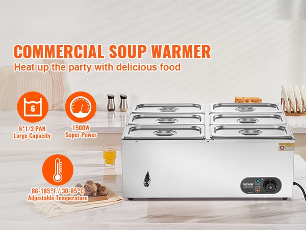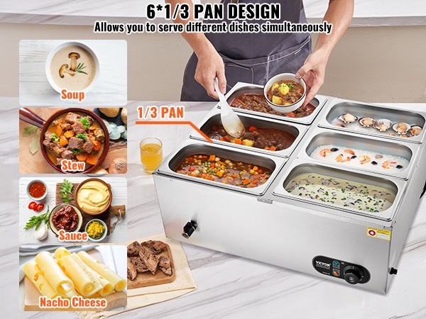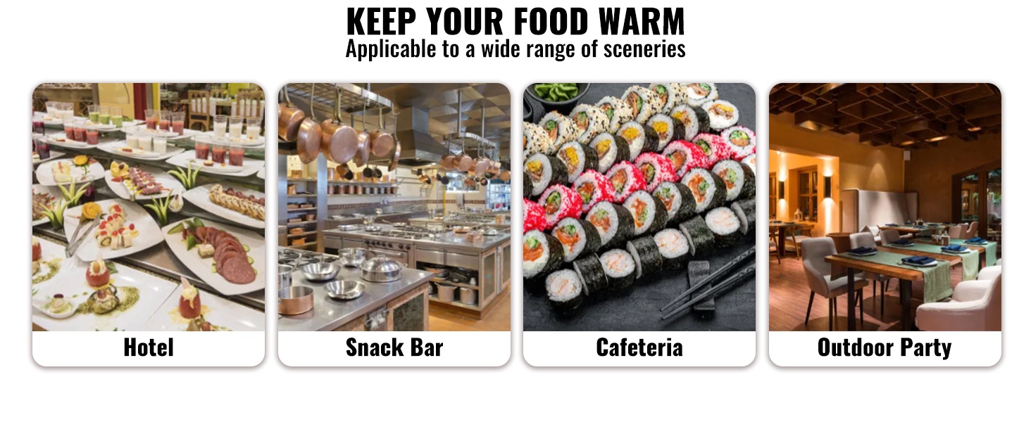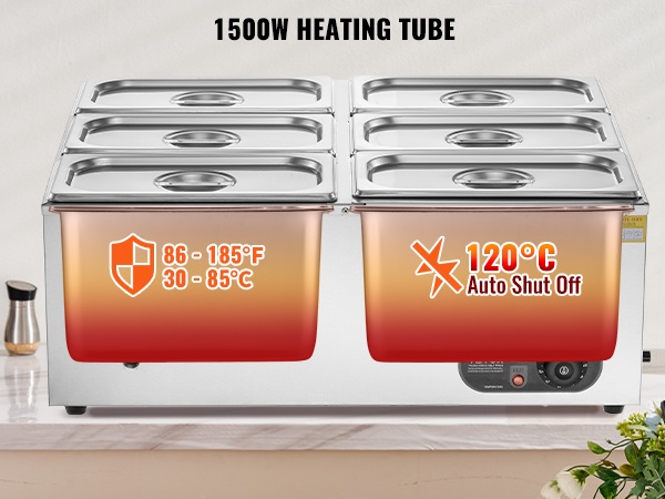 Tässä 6-astiaisessa ruostumattomasta teräksestä valmistetussa ruokien lämpöaltaassa on kuivakäyntiä estävä suojausjärjestelmä ja palautuspainike laitteen suojaamiseksi vaurioilta. Lämpötila-alue 86–185℉ / 30–85℃ mahdollistaa sopivan lämpöasetuksen valinnan eri ruoille, jotta ne pysyvät tarjoiluvalmiina koko tarjoilun ajan.