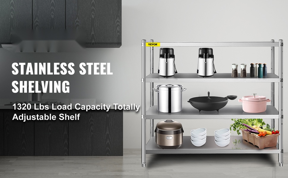 4-tasoinen ruostumattomasta teräksestä valmistettu hylly sopii monenlaiseen säilytykseen keittiössä, varastossa tai autotallissa. Harjattu teräspinta on helppo pitää puhtaana, eikä siihen kerry helposti likaa tai ruostetta. Jokainen taso kestää jopa 330 lbs kuormituksen, joten hylly soveltuu myös raskaiden tavaroiden säilyttämiseen.