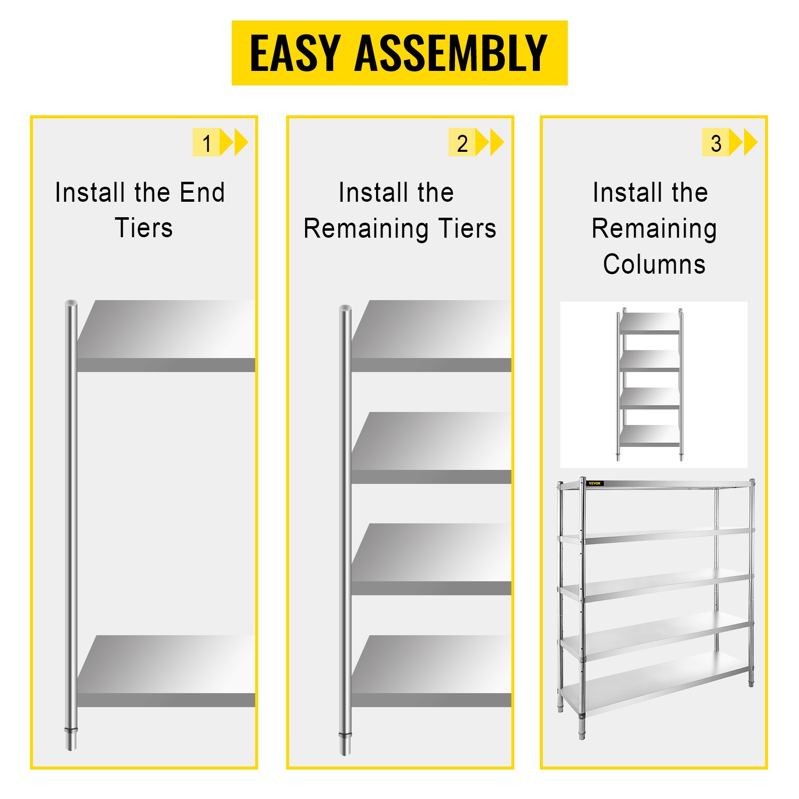 Hylly on suunniteltu nopeaan kokoamiseen. Tasot kiinnitetään pystypilareihin ruuveilla, ja neljä jalkaa ovat säädettävät, jotta hylly voidaan oikaista tukevasti myös hieman epätasaisella lattialla.