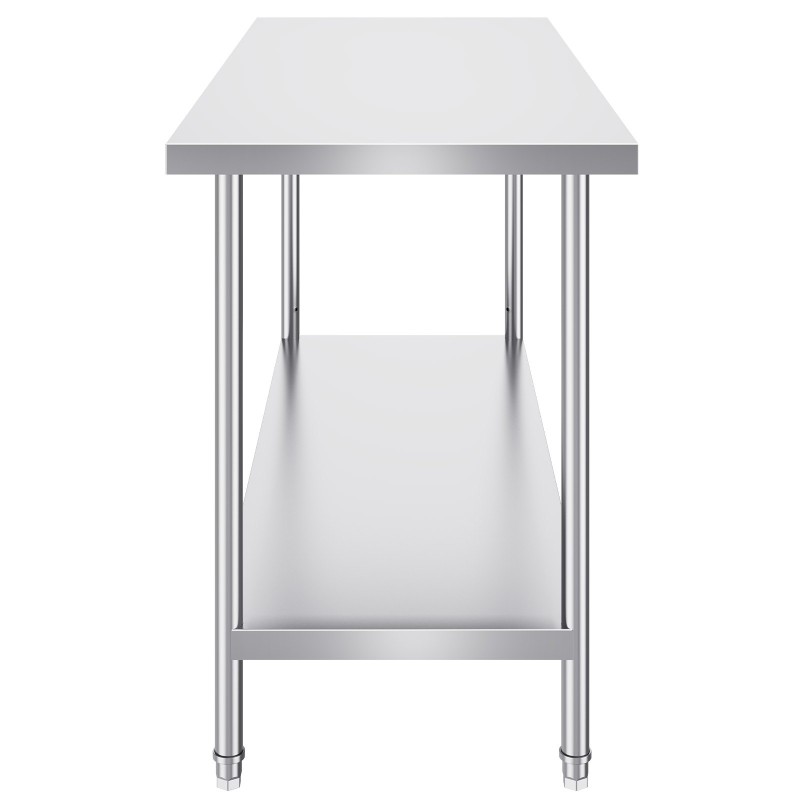 Tämä ruostumattomasta teräksestä valmistettu työtaso tarjoaa kestävän ja helposti puhdistettavan työskentelyalustan keittiöön, autotalliin, ravintolaan tai muuhun ammattikäyttöön. Kolme säädettävää korkeustasoa ja tukeva rakenne tekevät siitä käytännöllisen valinnan monenlaisiin tiloihin.