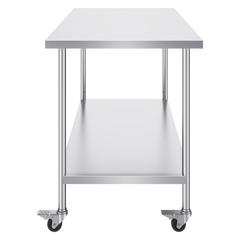 Tämä ruostumattomasta teräksestä valmistettu työpöytä on suunniteltu ammattimaiseen käyttöön keittiöihin, ravintoloihin ja muihin ympäristöihin, joissa tarvitaan kestävää ja helposti puhdistettavaa työtasoa. Kolme korkeussäätötasoa ja pyörät tekevät pöydästä joustavan ratkaisun erilaisiin tiloihin ja työtehtäviin.