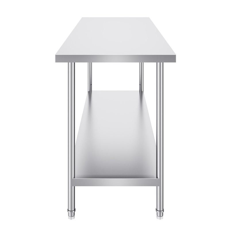 Tukeva ruostumattomasta teräksestä valmistettu työpöytä soveltuu sekä ammattikeittiöön että kotiin, autotalliin tai varastoon. Suurikokoinen työtaso tarjoaa runsaasti työskentely- ja laskutilaa, ja korkeussäädettävä alataso helpottaa erilaisten tarvikkeiden ja laitteiden järjestämistä.