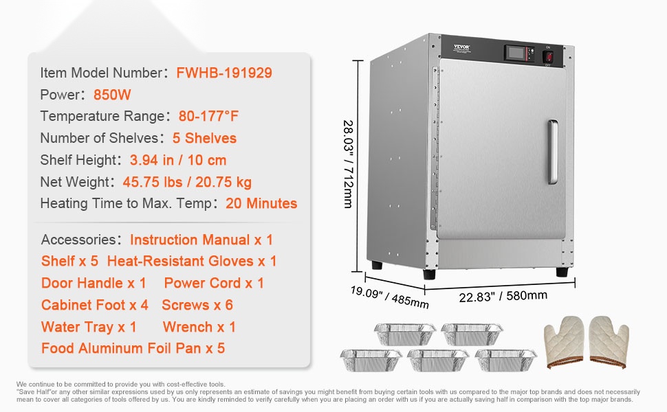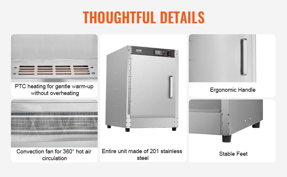 Hot box -ruokienlämmitin sisältää 5 irrotettavaa hyllyä, jotka ovat vakaampia kuin tavalliset verkkotasot. Hyllyjen korkeutta voi säätää ja ne voi tarvittaessa poistaa, jotta myös korkeammat tuotteet mahtuvat hyvin kaappiin.