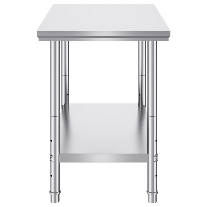 Pöydän taso, hyllyt ja jalat on valmistettu SUS201-ruostumattomasta teräksestä, joka tarjoaa hyvän korroosionkestävyyden ja siistin, ammattimaisen ulkonäön. Pinta on helppo pitää puhtaana ja soveltuu hyvin elintarvikekäyttöön sekä muuhun vaativaan työhön.