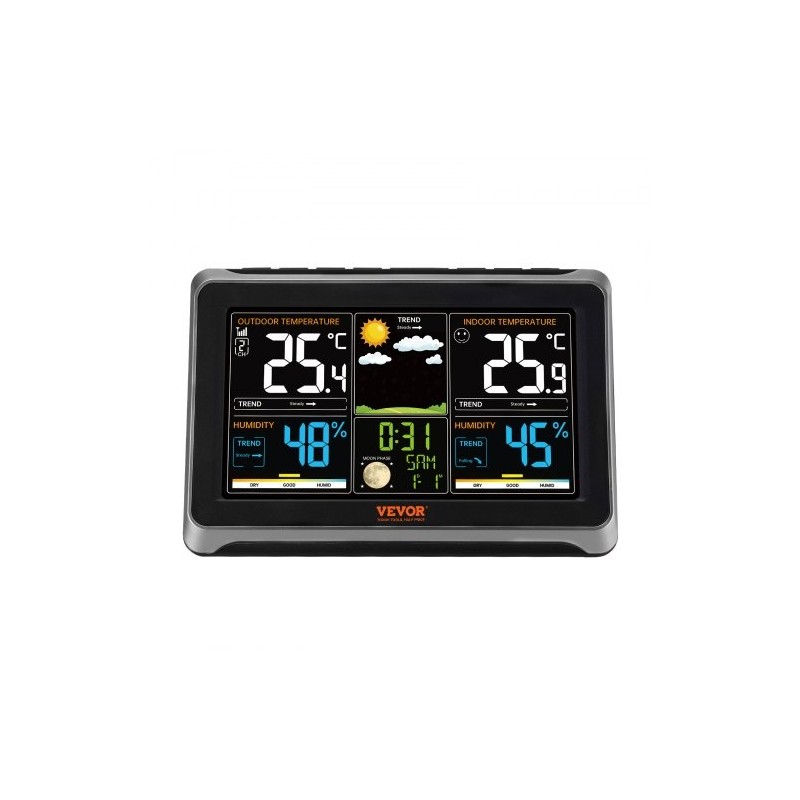 7.5-tuumainen langaton sääasema seuraa tarkasti lämpötilaa, kosteutta ja ilmanpainetta sekä kalibroi ajan automaattisesti. Laitetta voi käyttää myös kalenterikellona, ja sen suuri, helppolukuinen värinäyttö tarjoaa selkeät tiedot kotiin tai matkalle.