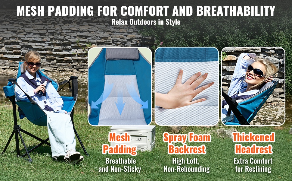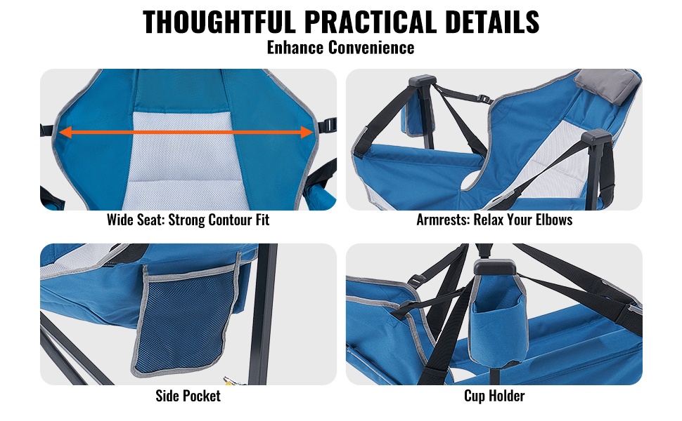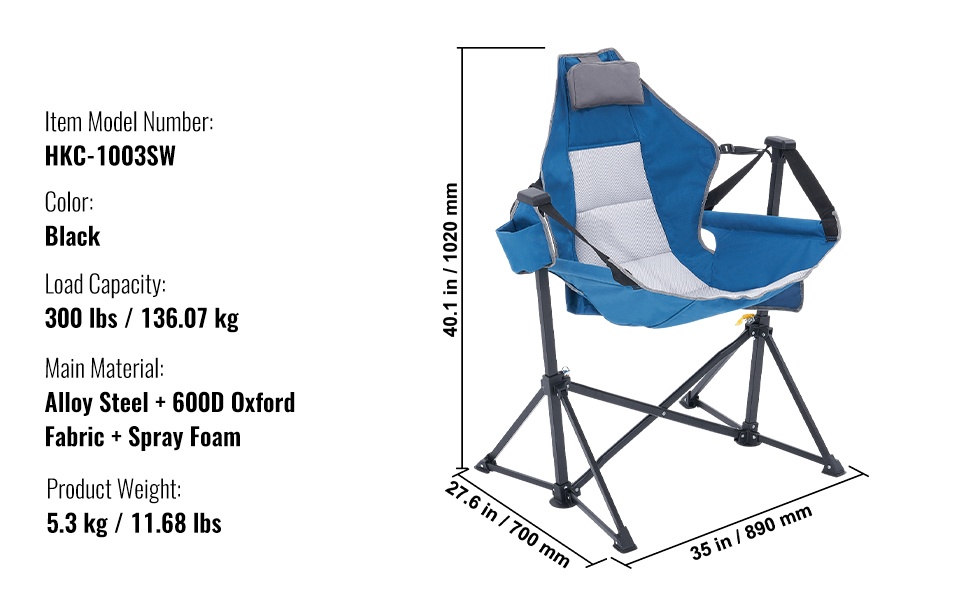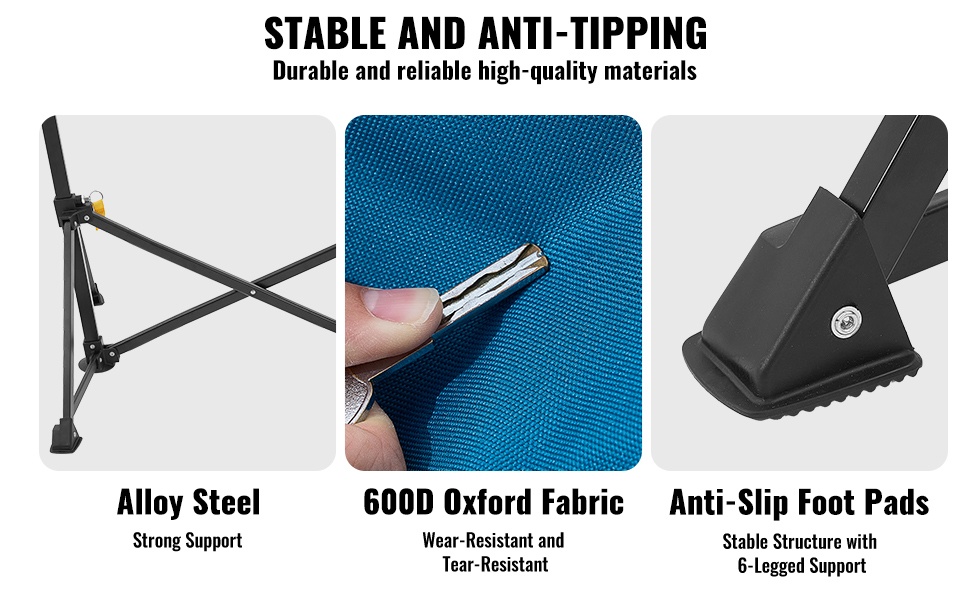 Vahva seosteräsrunko ja kestävä 600D Oxford -kangas takaavat pitkän käyttöiän. Tuolin enimmäiskuormitus on 300 lbs / 136.07 kg. Liu'unestävät jalkatulpat ja kuusijalkainen rakenne pitävät tuolin tukevasti paikallaan, jotta voit istua ja keinua huoletta.