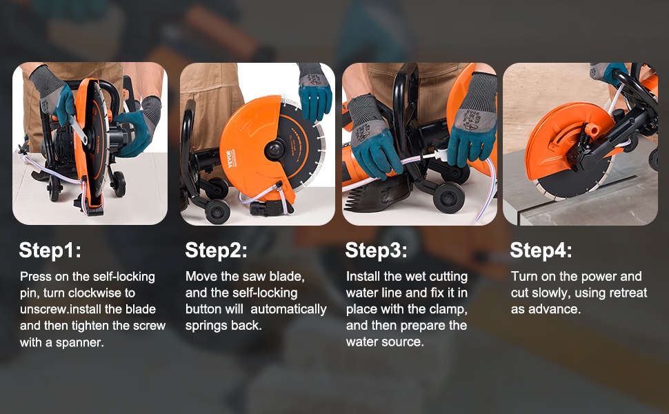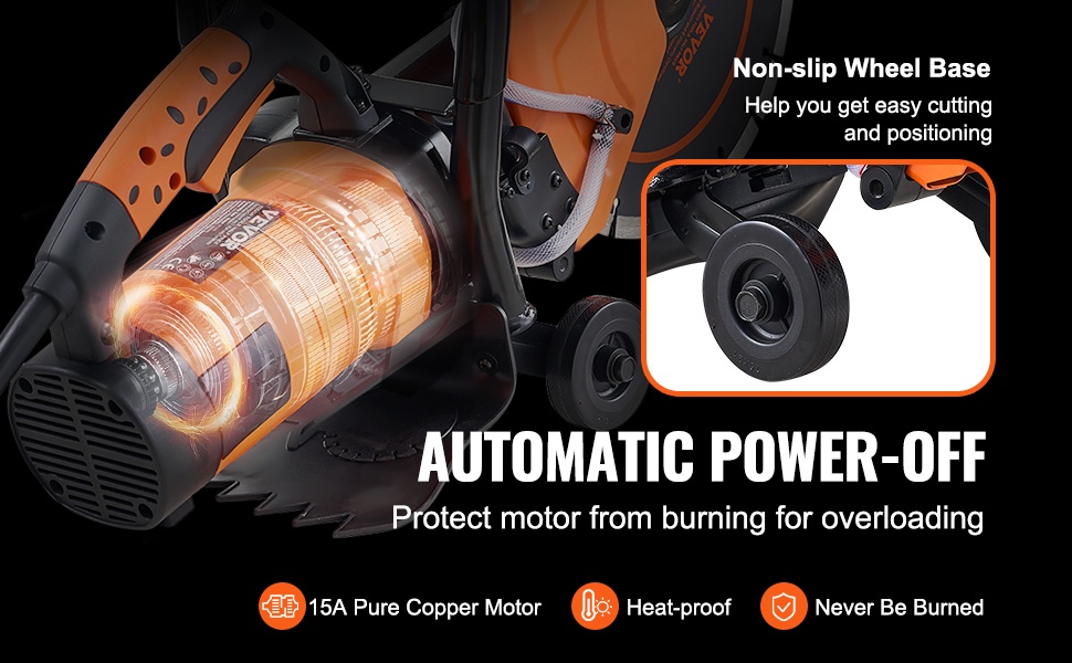 Sähköisessä betonisahassa on suoja, joka estää moottorin ylikuumenemisen liiallisen kuormituksen aikana. 15A:n puhtaasta kuparista valmistettu moottori kestää korkeita lämpötiloja ja pidentää laitteen käyttöikää.