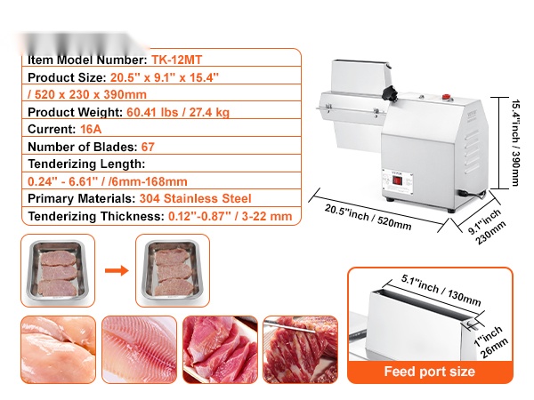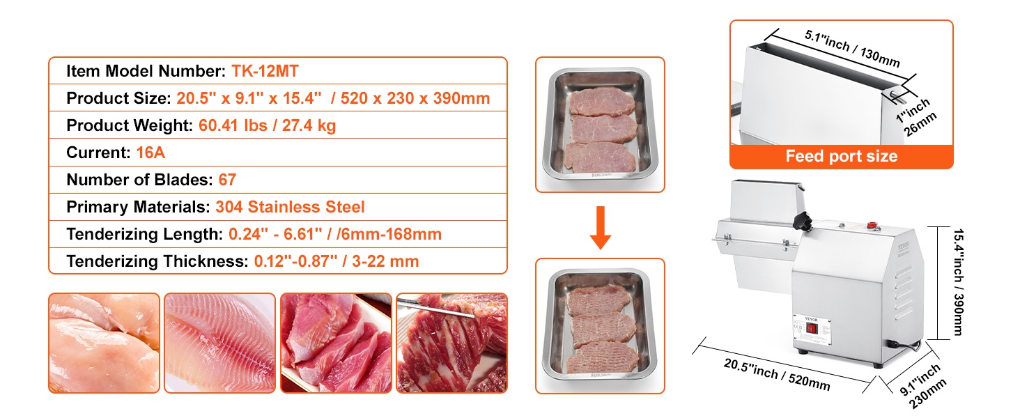 Laitteella voi mureuttaa esimerkiksi lampaan kyljyksiä, porsaan fileetä, kananrintaa, pihvejä, kalafileitä ja ankanrintaa. Mureutuspituus 6–130 mm ja paksuusalue 3–22 mm kattavat useimmat yleiset leikkeet ja annoskoot.