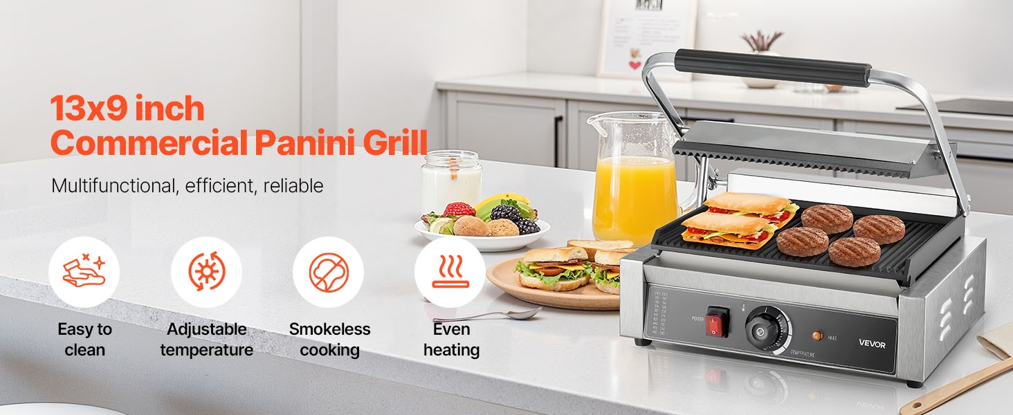 Tämä 2200W sähköinen paninigrilli on monikäyttöinen työtasolla käytettävä laite, joka soveltuu niin kotiin kuin ammattikäyttöön. Kompakti koko tarjoaa riittävän suuren paistopinnan viemättä liikaa tilaa työtasolta.