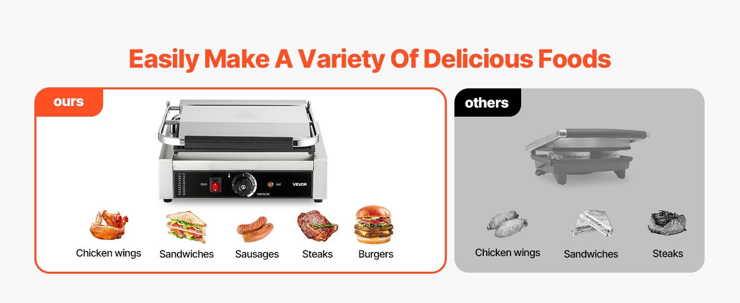 Grillin avulla voi kypsentää samanaikaisesti useita erilaisia ruokia, kuten vihanneksia, lihaa, grillattuja juustovoileipiä, munakkaita, panineja, hampurilaisia, kanaa, aamiaissettejä ja pihvejä. Sopii esimerkiksi perhejuhliin, kahviloihin, ruokakojuihin ja pieniin ravintoloihin.