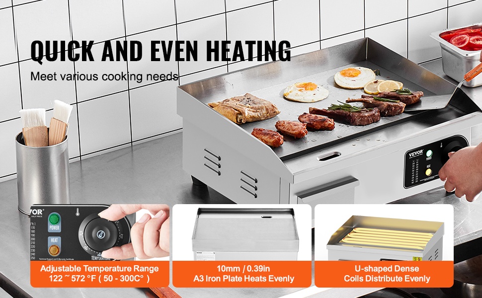 Sähköparilassa on portaattomasti säädettävä lämpötila-alue 122–572℉ (50–300°C). Suurennettu paistopinta-ala vastaa erilaisten ruokien samanaikaisiin kypsennystarpeisiin, mikä helpottaa työskentelyä sekä kotona että ammattikeittiössä.