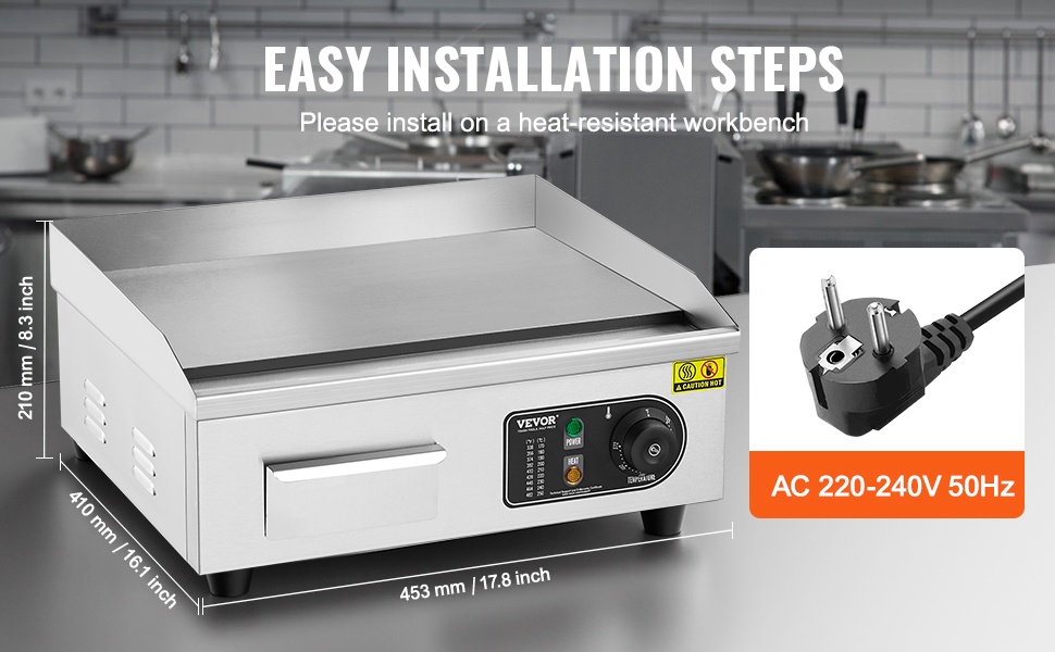 Sähköinen ammattikäyttöön sopiva parilalevy, jossa on paksu ja leveä A3-rautalevy. Tehokas lämmitys ja tarkka lämpötilansäätö jakavat lämmön tasaisesti, jolloin ruoasta tulee tasaisesti kypsää. Kestävä ruostumattomasta teräksestä valmistettu runko on helppo puhdistaa, ja laite soveltuu monenlaisten ruokien valmistukseen sekä kotikeittiöön että ravintolakäyttöön.
