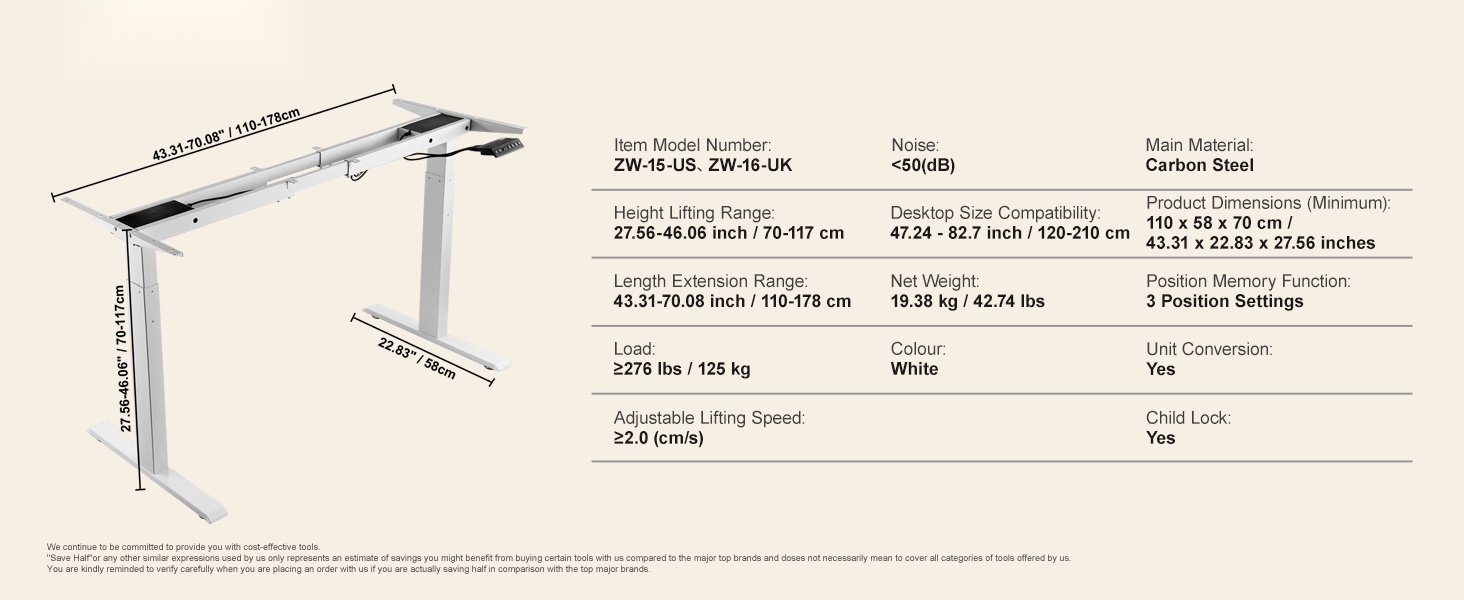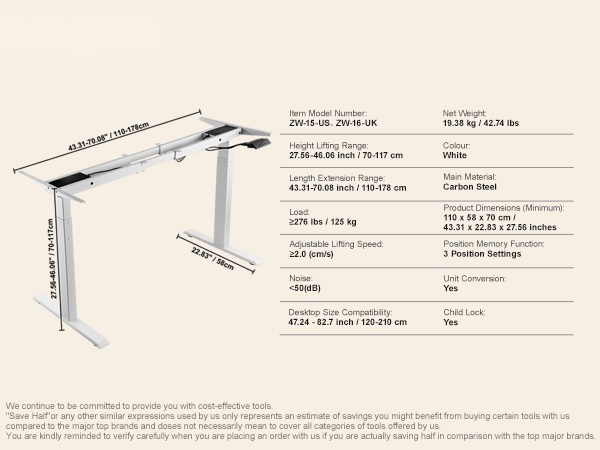 - Pöytätason koko (yhteensopiva): 47.24–82.7 inch / 120–210 cm