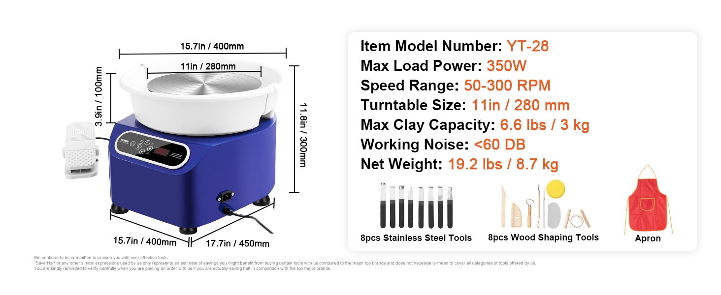 Sähköinen savenvalantakone toimitetaan 8 osan ruostumattomasta teräksestä valmistetulla työkalusarjalla, 8 osan puutyökalusarjalla, vedenpitävällä esiliinalla vaatteiden suojaamiseksi sekä kuusiokoloavaimella. Näiden avulla voit muotoilla, leikata ja viimeistellä teoksiasi monipuolisesti.