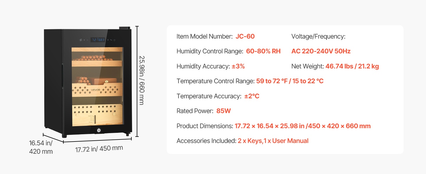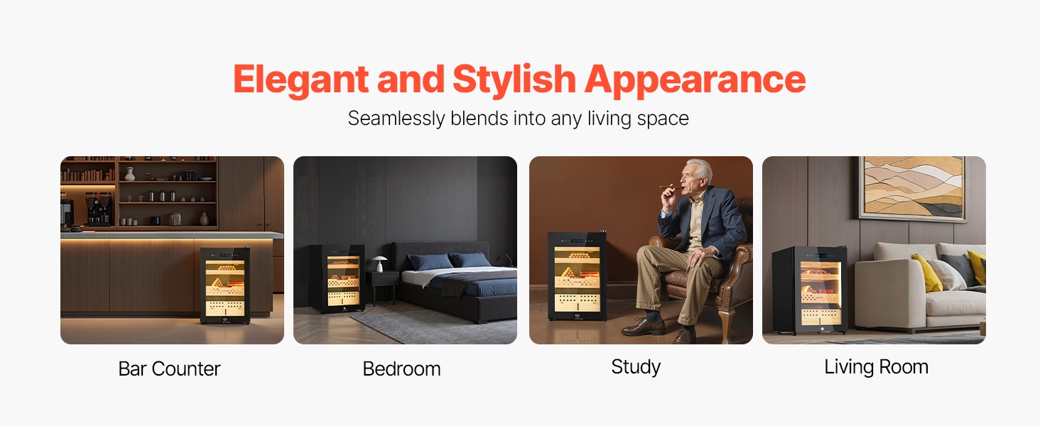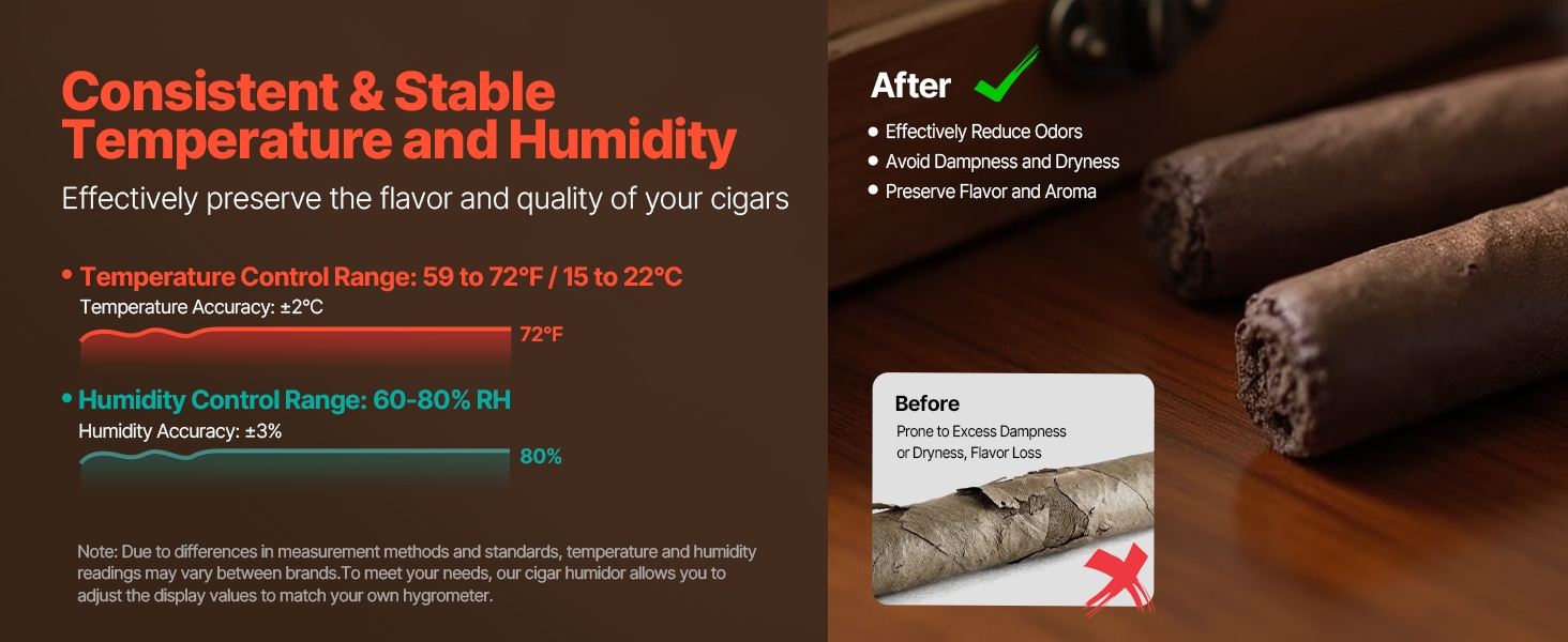 Säädettävä lämpötila-alue 59–72 ℉ / 15–22 ℃ ja kosteudensäätö 60–80 % RH auttavat estämään sikareiden kuivumisen tai liiallisen kostumisen. Tasaiset olosuhteet vähentävät ei-toivottuja hajuja ja auttavat säilyttämään sikareiden ominaisaromin ja täyteläisen maun.