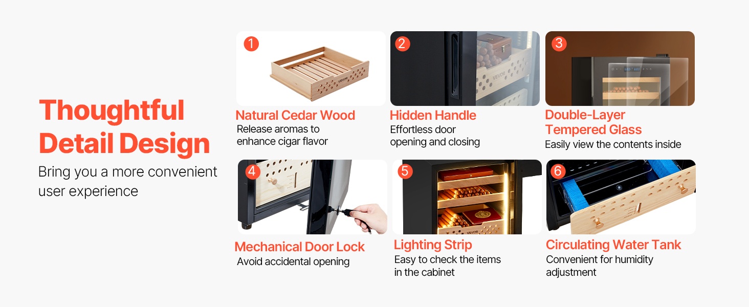 Luonnollinen espanjalainen setripuu vapauttaa miellyttävää tuoksua, joka tukee sikareiden säilyvyyttä. Piilotettu kahva ja kaksikerroksinen karkaistu lasi helpottavat kaapin käyttöä ja vähentävät lämpöhukkaa. Sisäinen LED-valo auttaa näkemään sisällön selkeästi, ja pohjassa oleva vesisäiliö tekee kosteuden ylläpidosta vaivatonta.