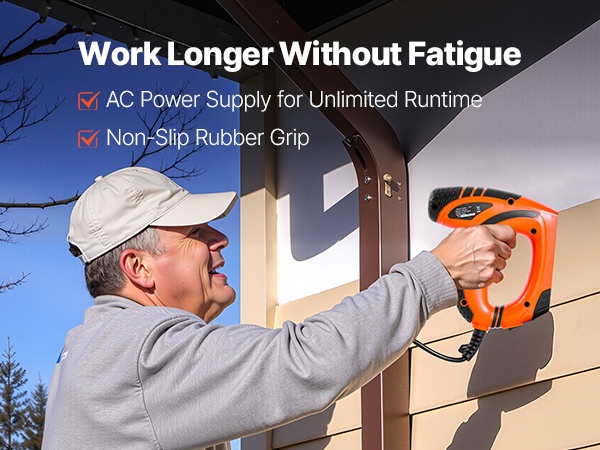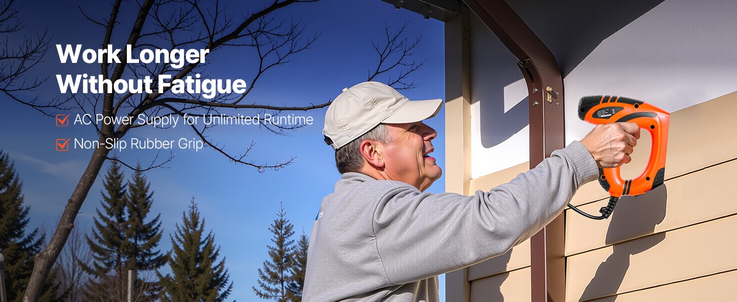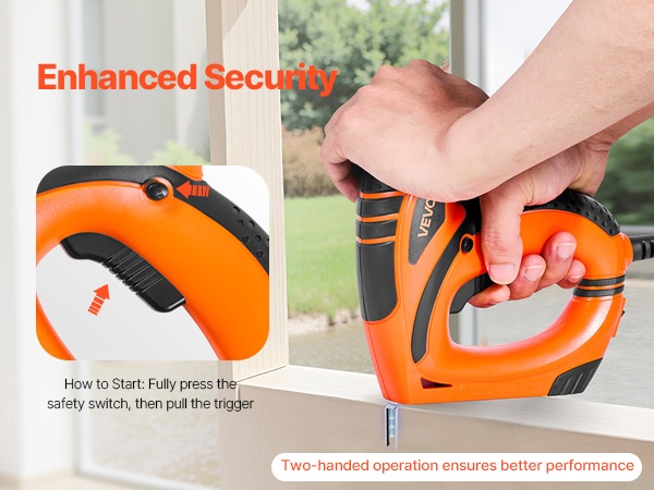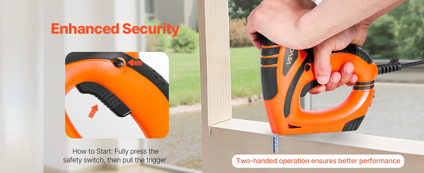 Virtakytkin ja kosketusturvajärjestelmä auttavat estämään tahattoman laukaisun. Käynnistääksesi laitteen paina ensin kärki tiiviisti materiaalia vasten ja vedä sen jälkeen liipaisimesta – kaksinkertainen suoja turvallisempaan käyttöön.