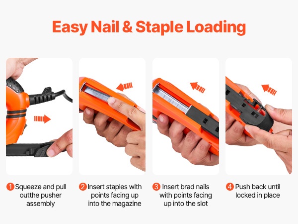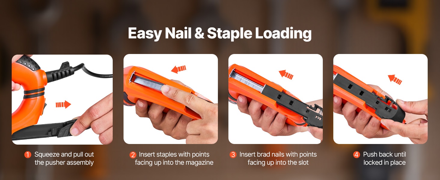 Lippaan täyttö käy neljän yksinkertaisen vaiheen kautta, joten niittien ja naulojen lisääminen on sujuvaa ja nopeaa.