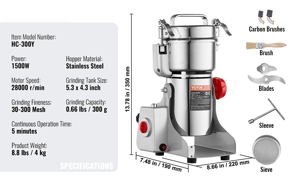 - Moottorin nopeus: 28000 r/min – hieno ja tasainen jauhatus (30–300 mesh)