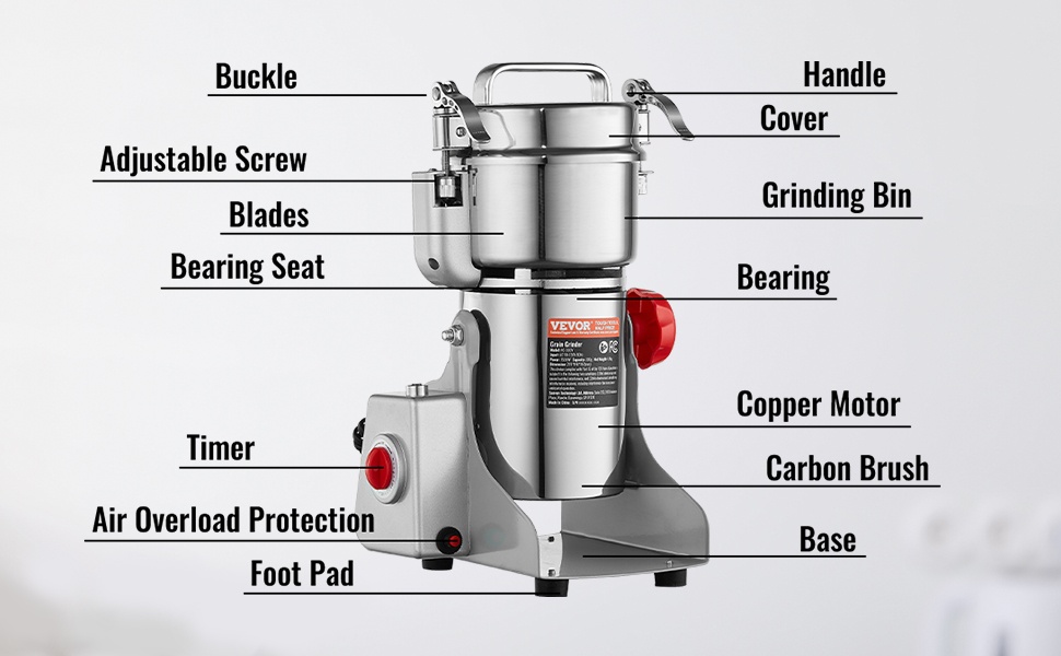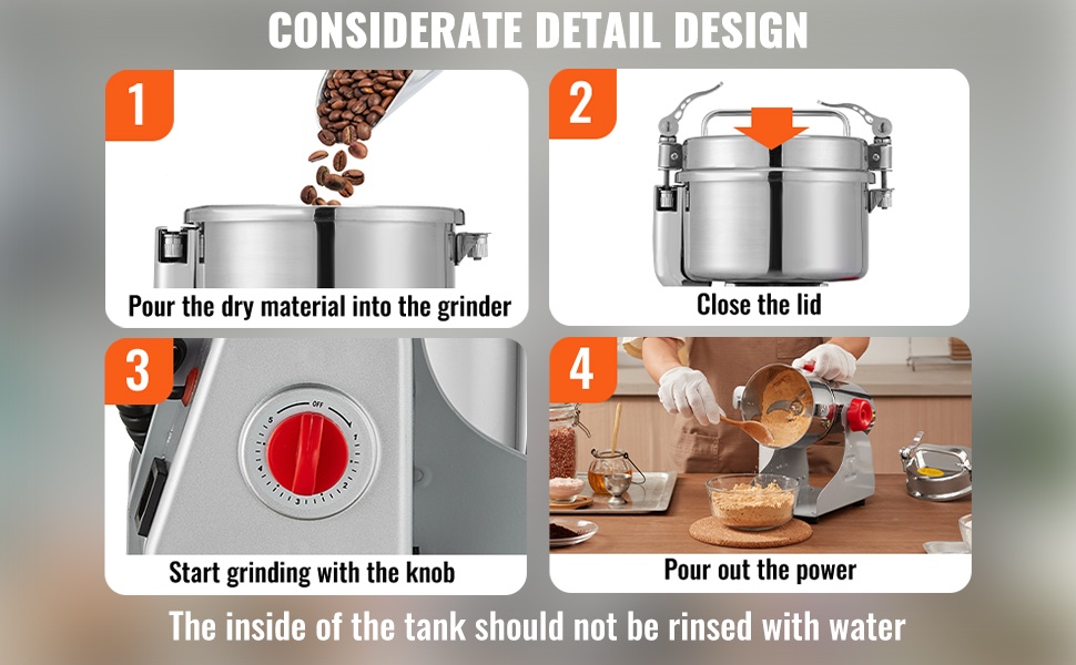 Tämä 2000W sähköinen viljamylly jauhaa kuivatuotteet nopeasti ja tasaisesti. 500 g jauhokammion tilavuus riittää hyvin kotikäyttöön ja pienimuotoiseen ammattikäyttöön. Kova, ruostumattomasta teräksestä valmistettu rakenne tekee laitteesta kestävän ja helpottaa puhdistusta.