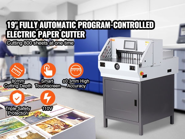 Tämä täysin automatisoitu hydraulinen paperileikkuri on suunniteltu suuriin leikkuumääriin. Laite leikkaa kerralla jopa 800 arkkia tavanomaista kopiopaperia ja sisältää varaterän sekä leikkuutangon, jotta leikkuujälki pysyy terävänä ja tehokkaana pitkään. Leikkuri soveltuu useille paperilaaduille, mutta ei harmaapahville tai PVC-muovilevyille.