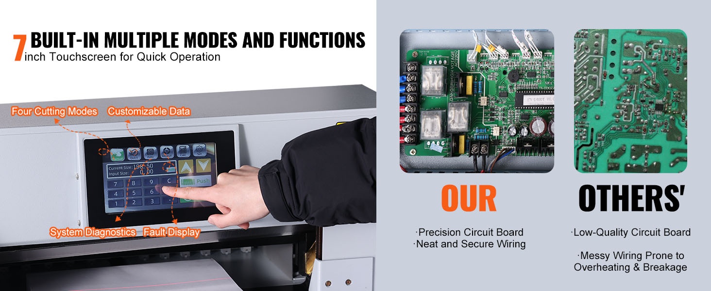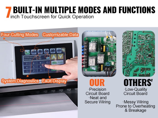 7-tuumainen kosketusnäyttö helpottaa asetusten hallintaa. Näytöltä voidaan valita neljä leikkuutilaa, säätää ja tallentaa leikkuutietoja jopa 100 asetuskokonaisuudelle ja 96 eri paperikoolle sekä tehdä järjestelmän omadiagnostiikkaa. Tämä helpottaa toistuvien töiden ohjelmointia ja vähentää manuaalista säätötarvetta.