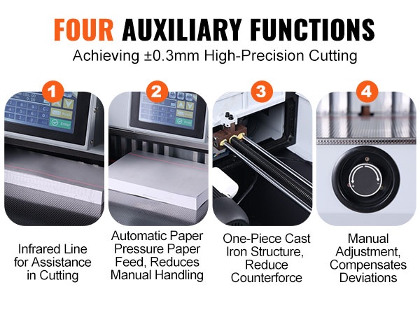 Leikkurin rakenteessa on useita ominaisuuksia, joilla leikkuutarkkuus pidetään ±0.2 mm sisällä. Infrapunasuuntain auttaa kohdistamaan paperipinon selkeästi. Automaattinen paperin puristus ja syöttö vähentävät käyttäjästä johtuvia vaihteluita. Rungon jäykkyys pienentää muodonmuutoksia, ja manuaalinen hienosäätö mahdollistaa pienten kokoerojen kompensoinnin.