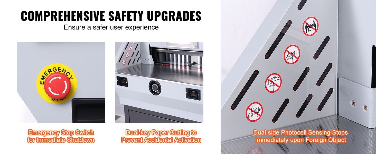 Turvallisuus on huomioitu laitteen suunnittelussa. Leikkuualuetta ympäröivät infrapuna-anturit pysäyttävät laitteen, jos valonsäde katkeaa esimerkiksi käden tai vieraan esineen vuoksi. Kaksipainikkeinen käynnistys estää tahattomat käynnistykset, ja hätäpysäytyspainike mahdollistaa laitteen nopean sammutuksen poikkeustilanteissa.