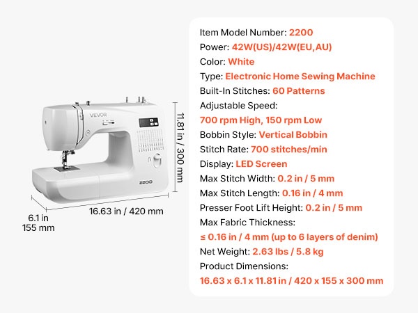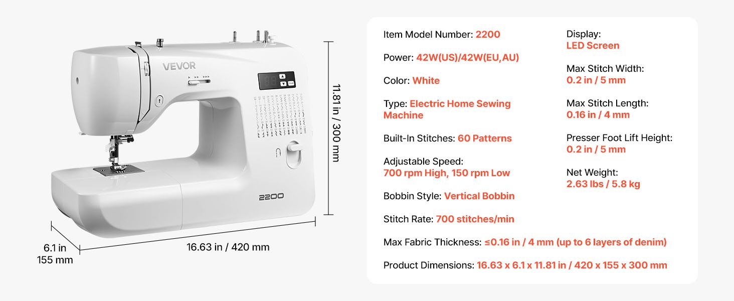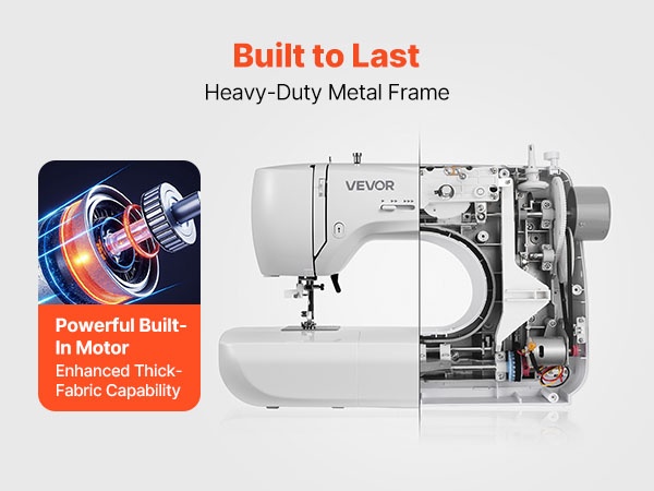 Koneessa on kestävä, kokonaan metallinen sisärunko, joka pitää laitteen vakaana myös suuremmalla nopeudella tai paksumpia kankaita ommeltaessa. Tehokas moottori selviää jopa 0.16 in / 4 mm paksuisista materiaaleista (enintään 6 kerrosta farkkua), joten voit ommella esimerkiksi pellavaa, sifonkia ja tiivistä farkkukangasta luotettavasti.