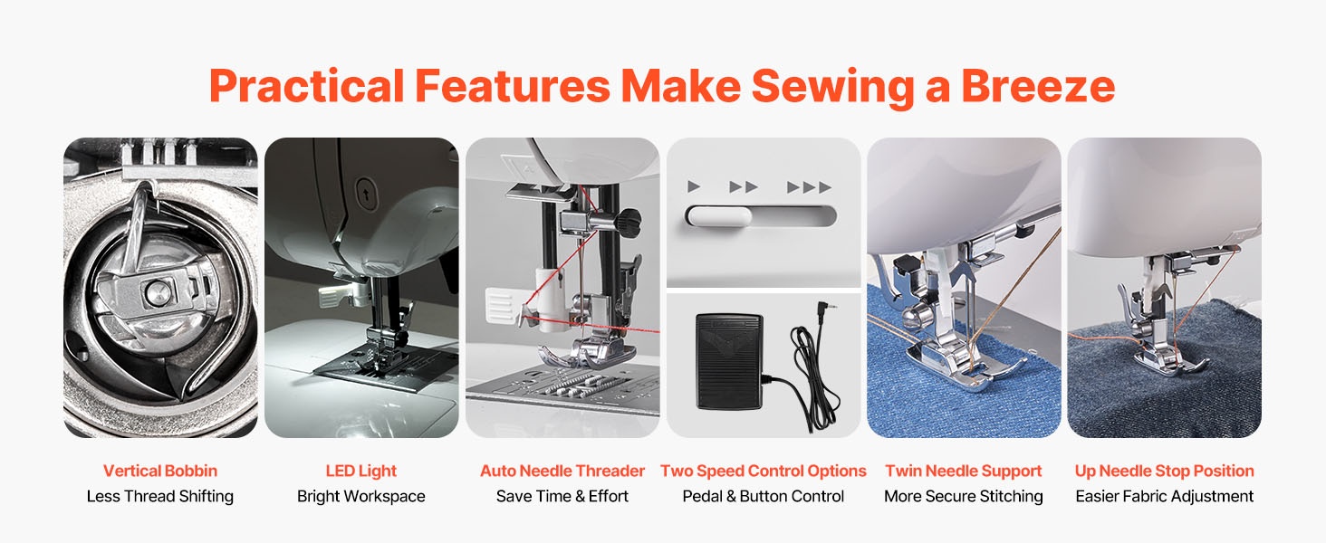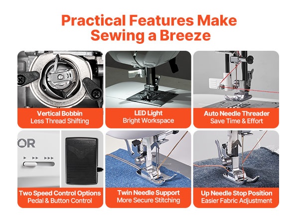Vaakatason puolakotelo on läpinäkyvä, joten langan määrä on helppo nähdä ja puola on helppo täyttää. Työskentelyaluetta valaiseva LED-valo parantaa näkyvyyttä, ja automaattinen neulan langoitus säästää aikaa. Ompelunopeutta ohjataan jalkapoljinta käyttäen, enimmäisnopeus on 700 pistoa minuutissa.