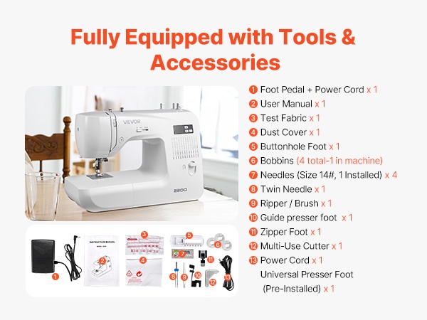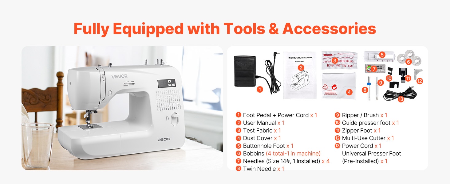 Pakkaukseen kuuluu oleellisia paininjalkoja, ompelutarvikkeita (neuloja, läpinäkyviä puolia) sekä käytännöllisiä apuvälineitä (huopatyyny, koekangas jne.). Materiaalien ja huoltotarvikkeiden ansiosta pääset aloittamaan erilaiset ompelu- ja korjausprojektit heti.