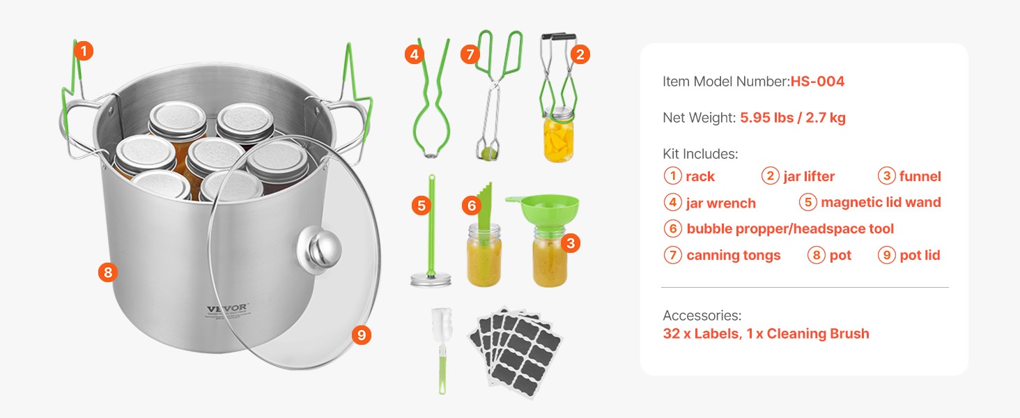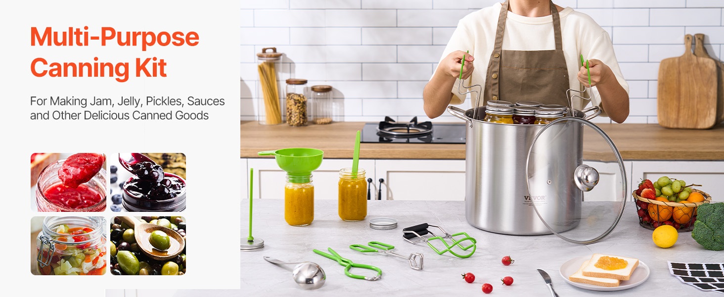 Tämä 9-osainen vesikylpysäilöntäpakkaus sisältää kaikki perusvälineet kotitekoisten hillojen, vihannesten ja muiden säilykkeiden valmistukseen. Setti sopii sekä aloittelijoille että kokeneille kotikokeille, jotka haluavat säilöä turvallisesti ja siististi.