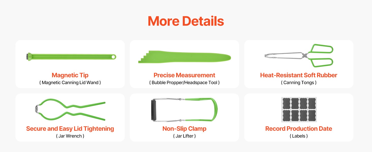 Paketti sisältää olennaiset välineet, kuten puristinavaimen, purkinostimen ja muut käytännölliset tarvikkeet, jotka helpottavat säilöntää ja tekevät työskentelystä sujuvaa. Kokonaisuus vastaa useimpiin kotisäilönnän tarpeisiin.