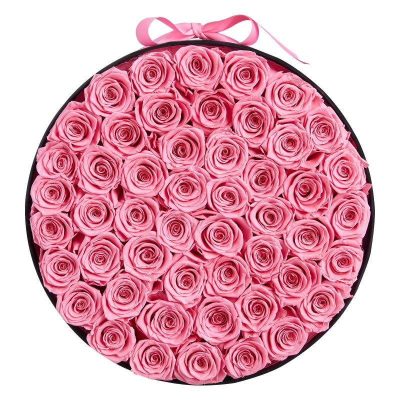 Säilötyt aidot ruusut 50 kpl pyöreässä lahjarasiassa vaaleanpunaisina