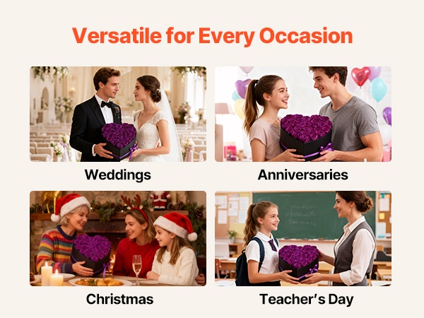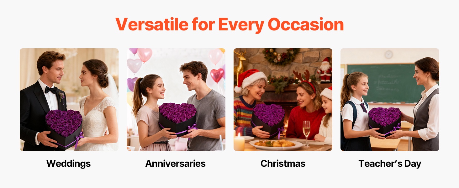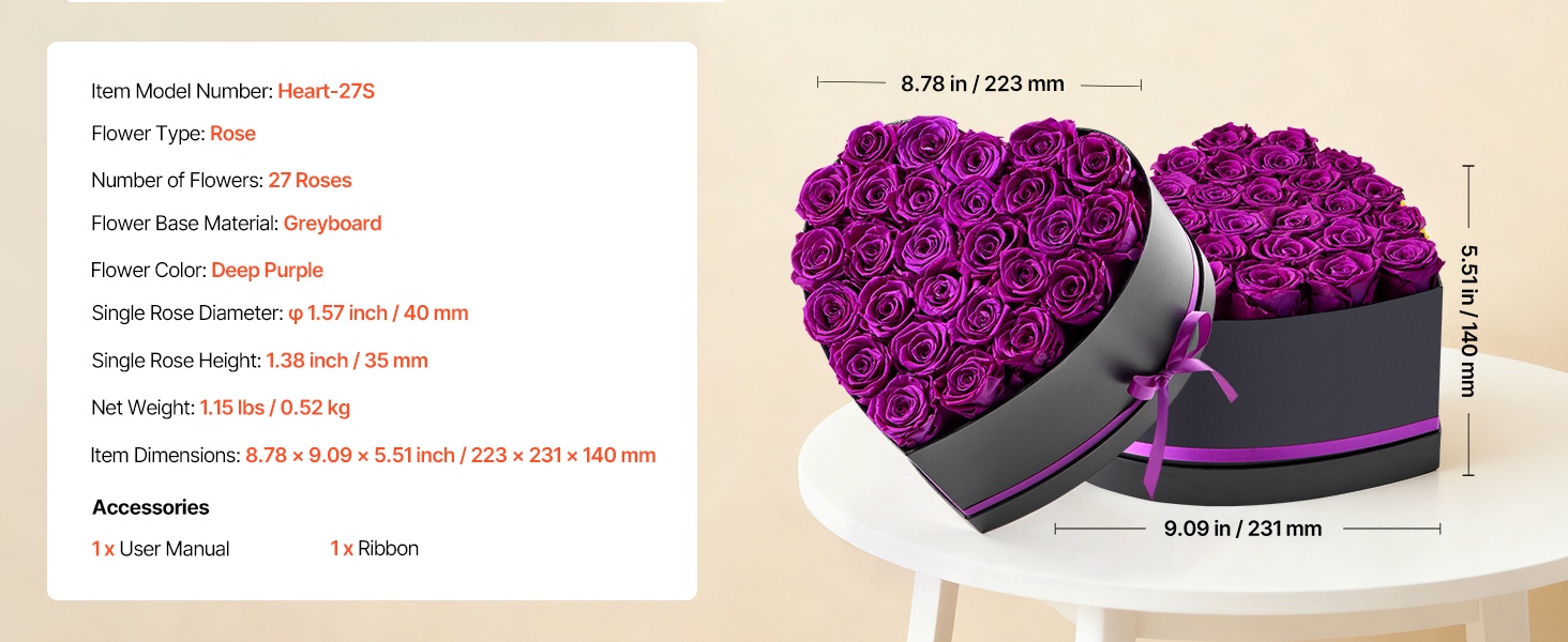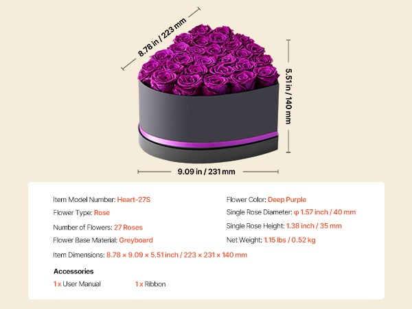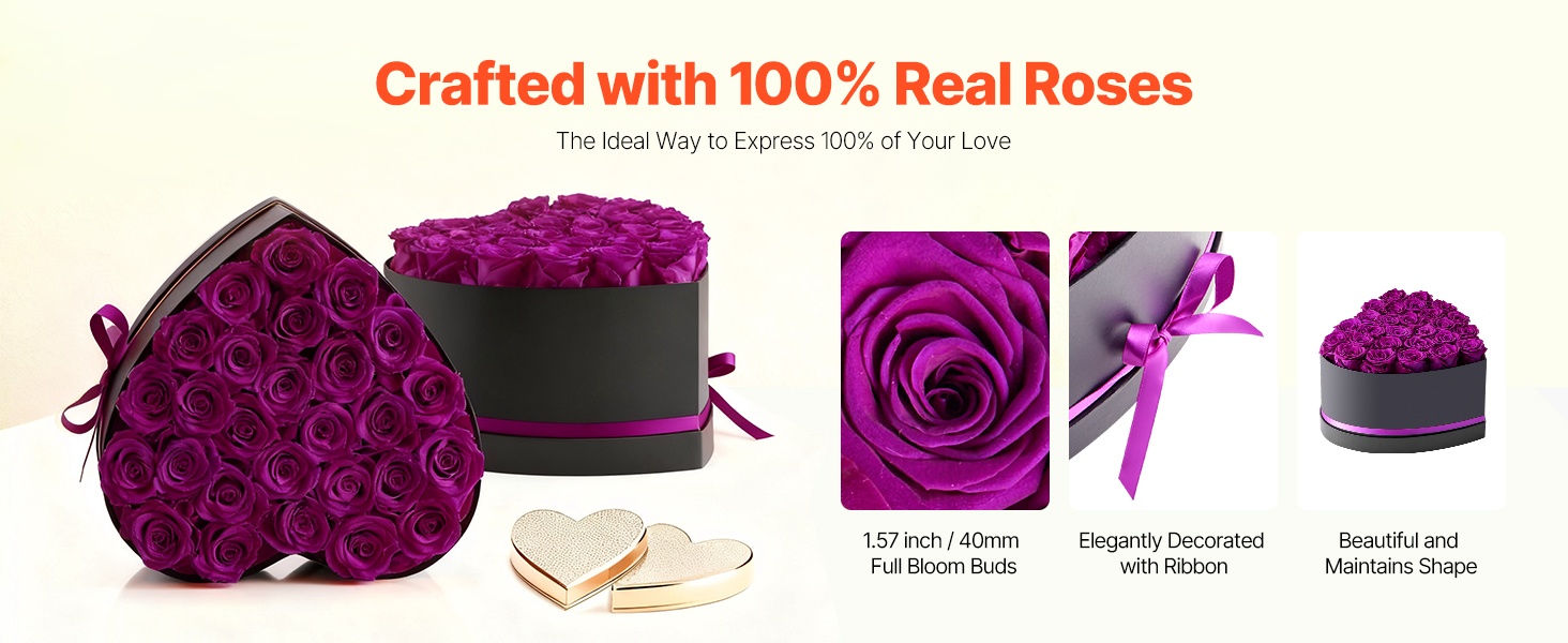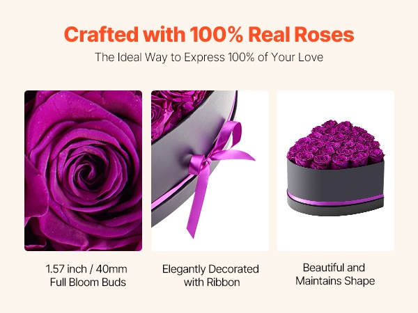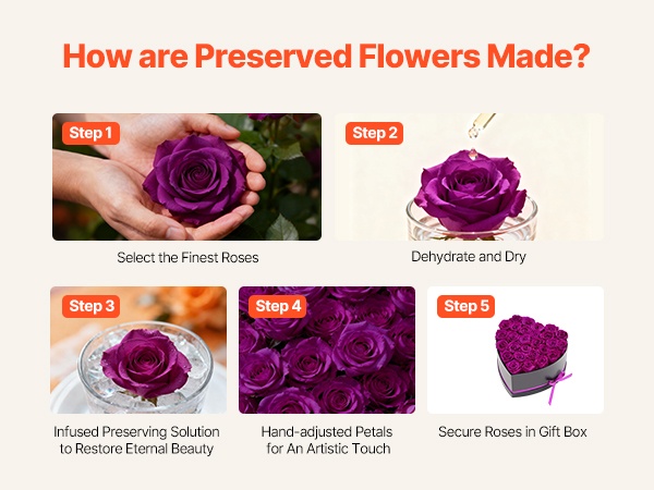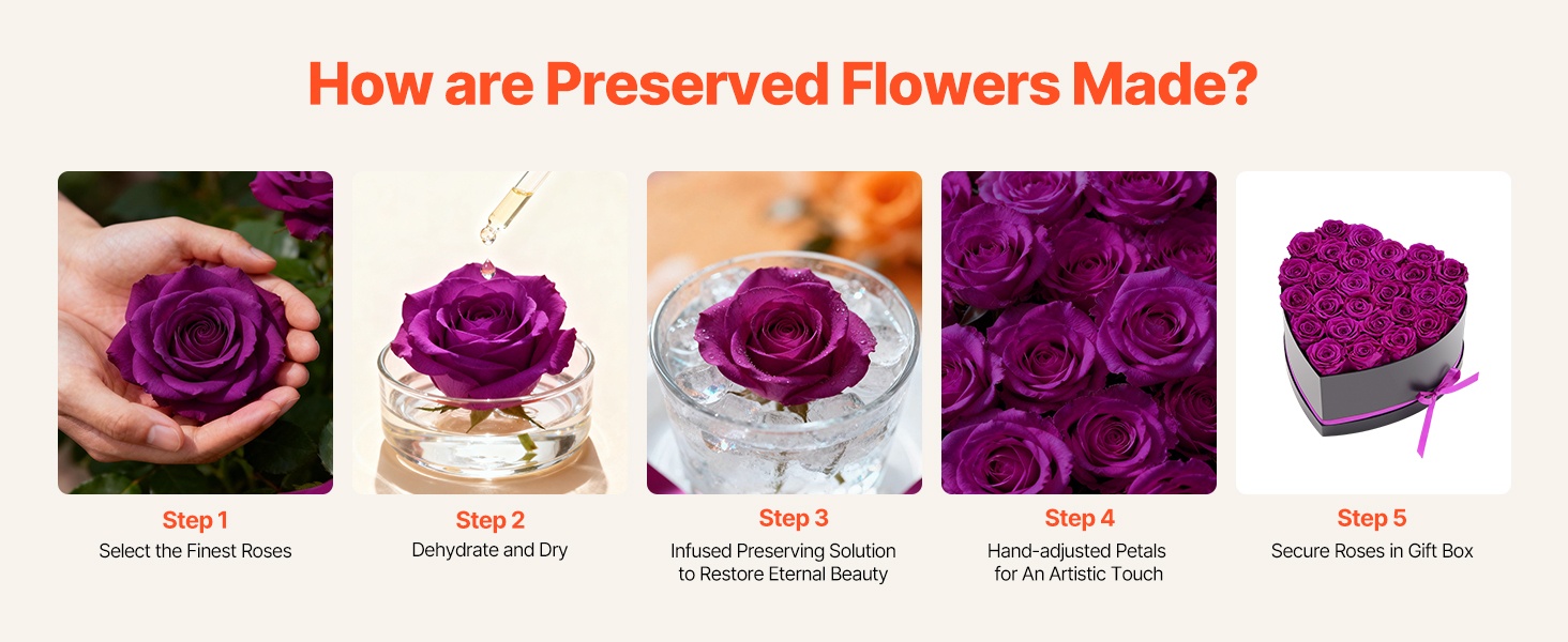 Säilötyt ruusut on valmistettu 100 % aidoista, täyskokoisista kukinnoista, joissa on voimakkaat värit. Ne eivät vaadi kastelua tai auringonvaloa, joten jokainen juhlahetki säilyy romanttisena muistona pitkään.