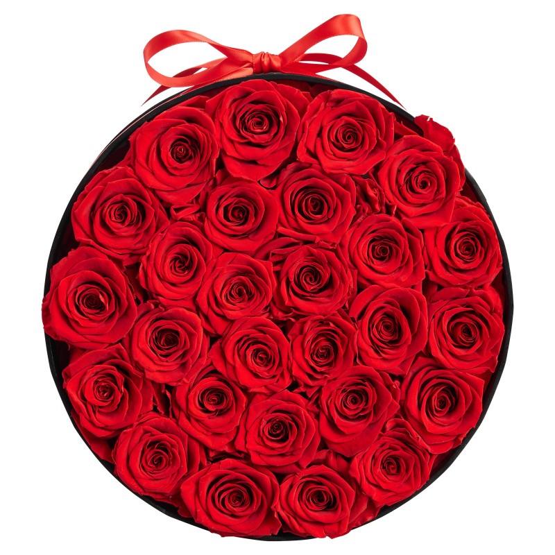 Säilötyt aidot ruusut pyöreässä lahjapakkauksessa 27 kpl kirkkaanpunaiset